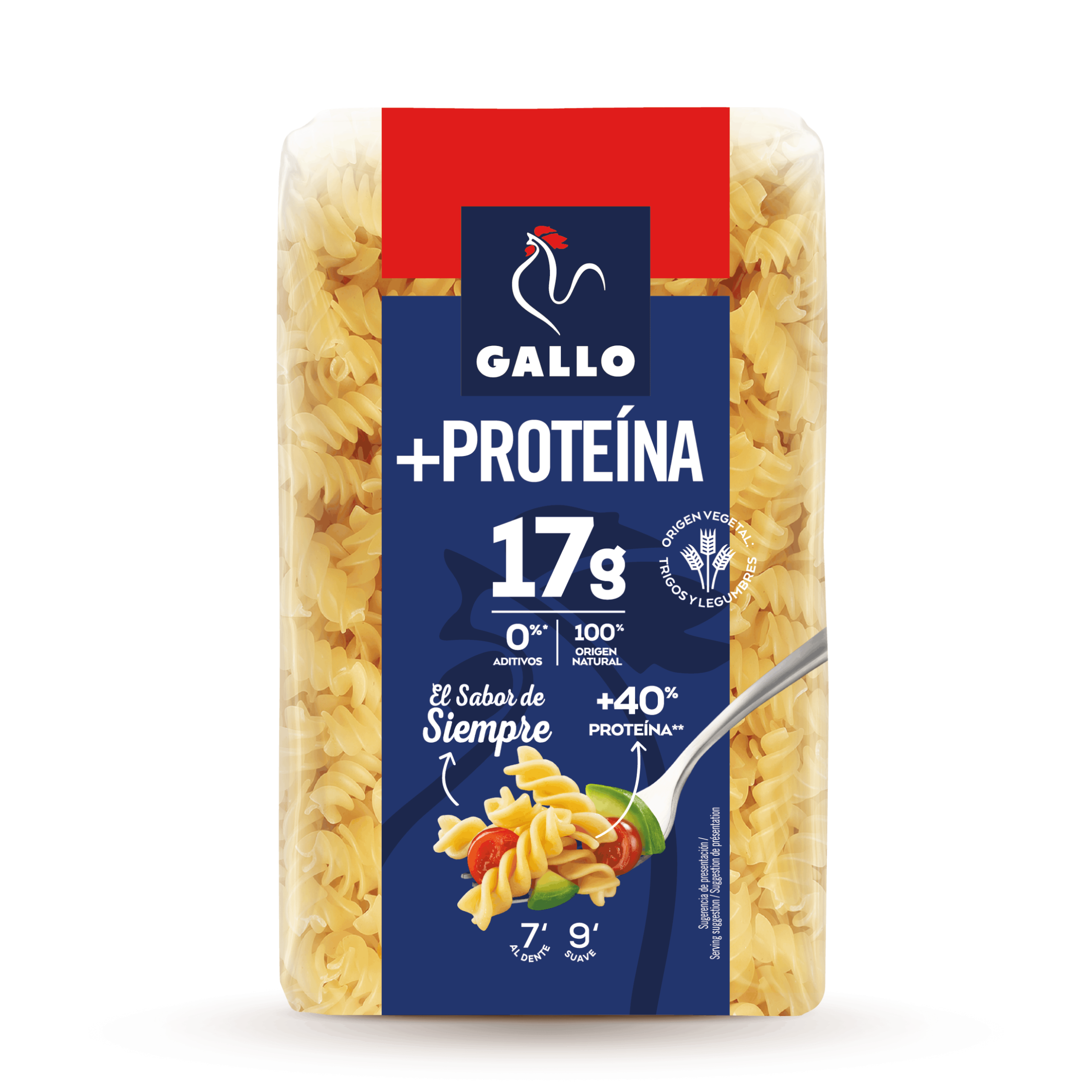 Las Hélices Gallo +Proteína combinan el sabor clásico de la pasta Gallo con un 40 % más de proteína (17 g por cada 100 g). Elaboradas con proteína vegetal del guisante, son 100 % naturales, de origen vegetal y sin colorantes ni conservantes. Ideales para ensaladas o platos con salsa, aportan energía, sabor y textura firme en cada bocado.